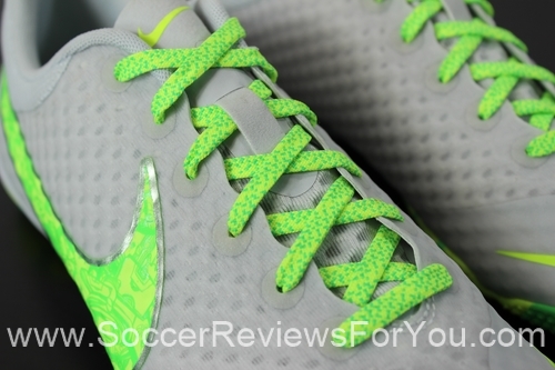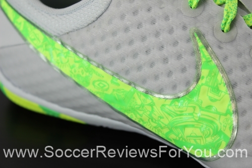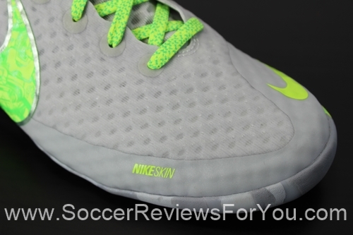 The upper is constructed from Nike’s brand new “Nike Skin” synthetic, which combines mesh and fused layers of PU to form an upper that is extremely thin and flexible, allowing for a very comfortable fit, and even a little bit of breathability. Nike Skin is comprised of two separate layers, with the first layer being made from a very thin mesh, knitted is somewhat of a “honeycomb” pattern, while the outer layer is basically a Polyurethane membrane. What’s great about this material from Nike is not only that it provides a great touch on the ball, but it also allows Nike to change the thickness of the upper in any spot they choose. For example, the Elastico Finale 2 features mainly one single PU layer across the entire upper, while all of the areas where the upper meets the sole, has an extra PU layer, which not only reinforces the upper for lateral movements, but also enhances the durability of the boot. Its very difficult to describe the feel of Nike Skin, but the main takeaways are that its very thin, slightly padded and very flexible, offering a feel that I would compare to a sock.